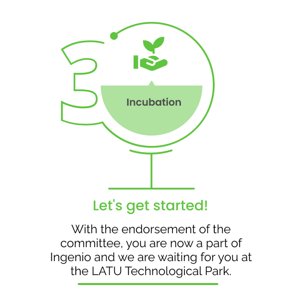 At Ingenio, the incubation starts once the project has been approved by the Selection Committee. After signing the contract, we begin with 12 months of hard work alongside the incubator team, consultants, mentors, industry leaders, agencies, among others.